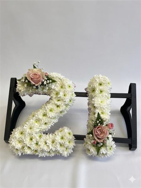 Any number and 2 Letter designs are able to order from this product, all you have to do is type in using the drop box below what letters or numbers you would like and what colours of ribbon and top spray too.