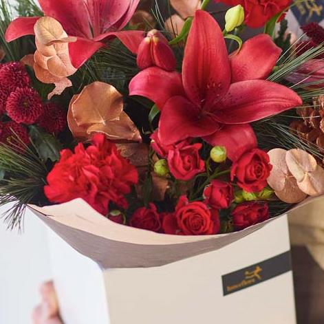 A quick rundown: a beautiful bouquet of fresh festive flowers carefully chosen and arranged by a talented local florist.