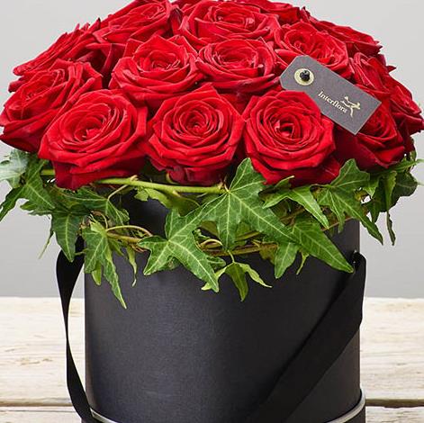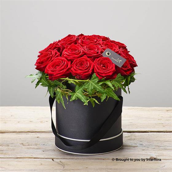 Featuring red large headed roses with variegated ivy and pistache, presented in a tall black and cream hatbox.
