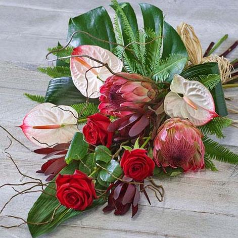 Vibrant blooms, including red roses and white anthuriums, meets rich foliage including a monstera leaf and umbrella fern.